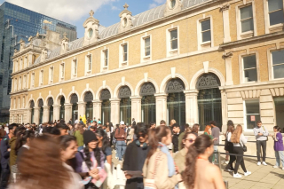On a sunny Thursday in September, with the stunning backdrop of the London skyline on the River Thames, thousands of students lined up at Old Billingsgate to attend KCLSU’s Welcome Fair. We’d made sure for the KCLSU brand to be loud and proud throughout the lofty venue, with large hanging banners, wayfinding cubes and signs, a digital map, and activities to support brand engagement, such as a spin-the-wheel game, tote bags and giveaways.